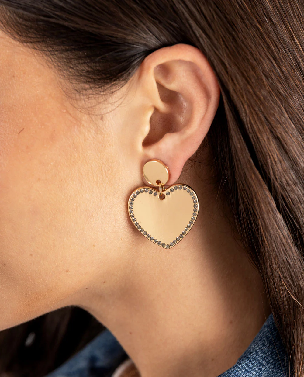 Aretes colgantes en forma de corazón con acabado dorado espejo, delineados por una delicada hilera de cristales que reflejan la luz con cada movimiento. El diseño combina elegancia y modernidad, ideal para elevar un look romántico o de noche. Su cierre tipo topo asegura un ajuste cómodo y seguro. Una pieza que destaca por su brillo sutil y estilo encantador.