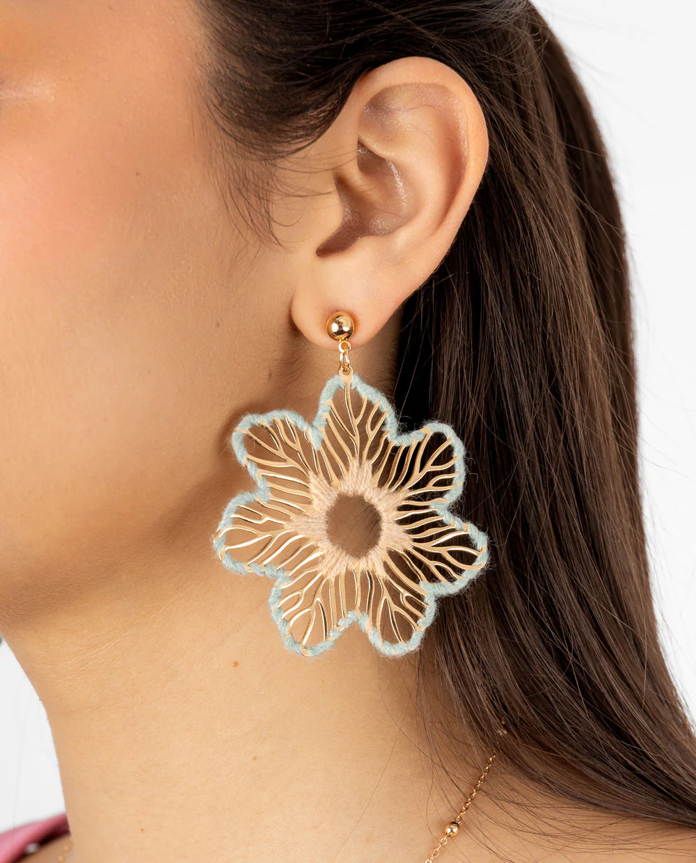 Estos aretes en forma de flor calada combinan tonos pastel suaves con detalles dorados que iluminan cualquier look.