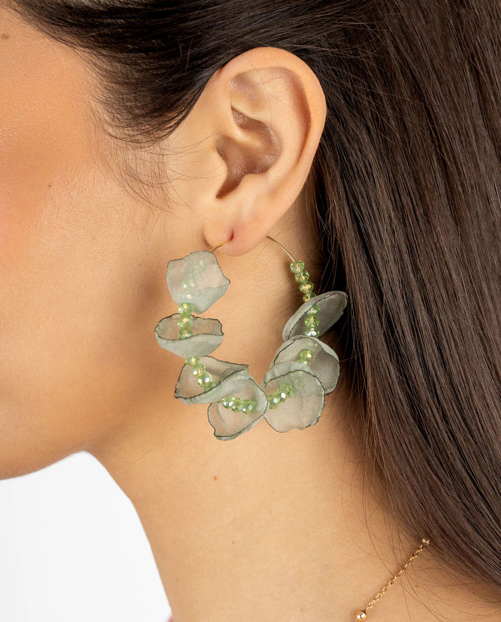 Aretes circulares con pétalos de tela translúcida en tono verde y cuentas decorativas que aportan movimiento y un acabado delicado y femenino.