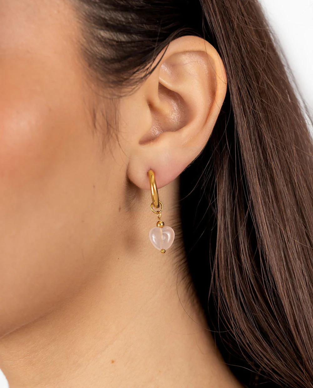 Aretes de aro en acero inoxidable bañado en oro con dije de corazón tallado en cuarzo rosa. Un diseño delicado y romántico que resalta la feminidad en cada look. El cuarzo rosa, símbolo de amor y armonía, convierte estos aretes en el complemento ideal para elevar tu estilo con un brillo especial en cualquier ocasión.