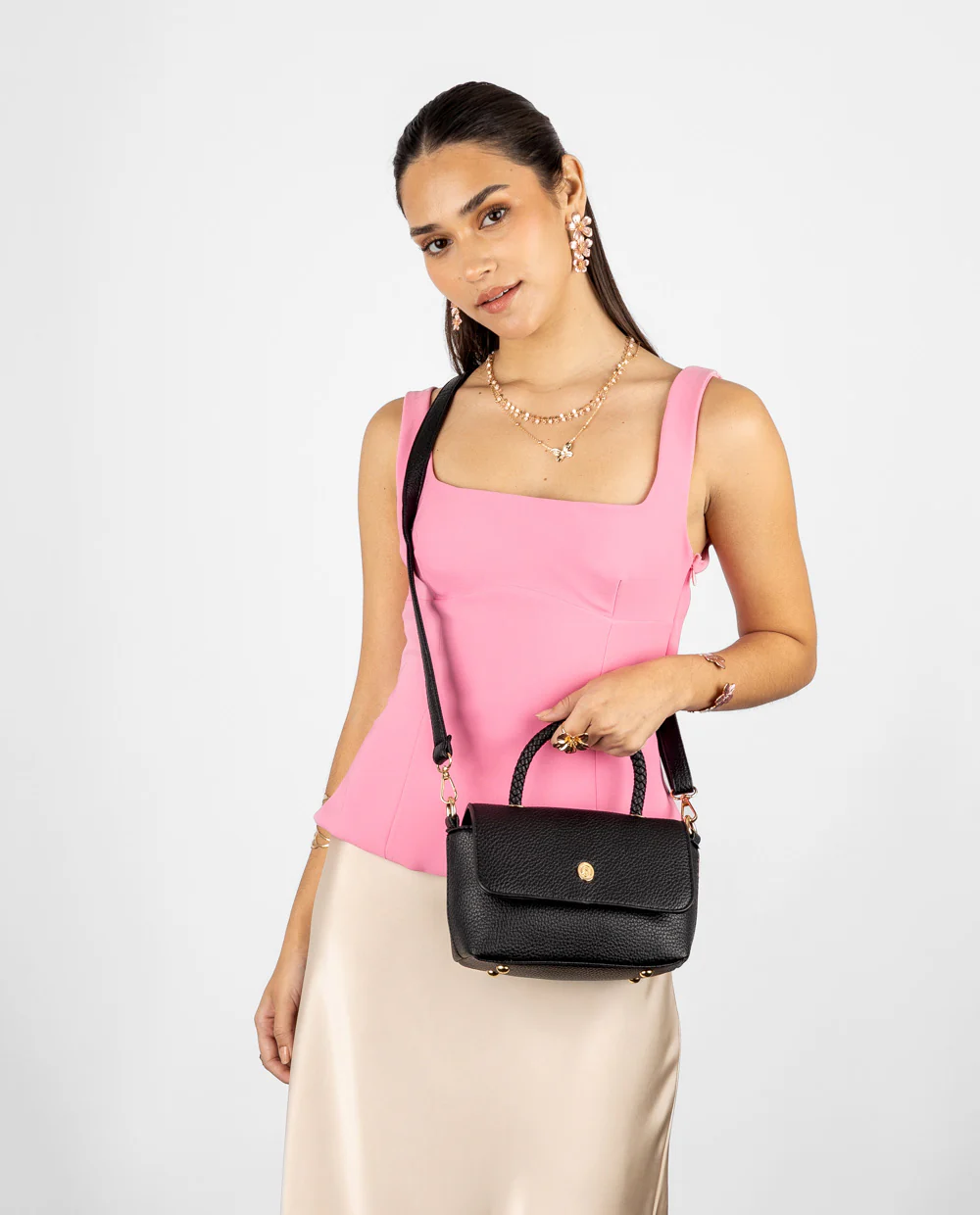 Cartera negra de textura suave con tapa frontal y asa trenzada. Incluye correa ajustable y desmontable, para llevarla cruzada.