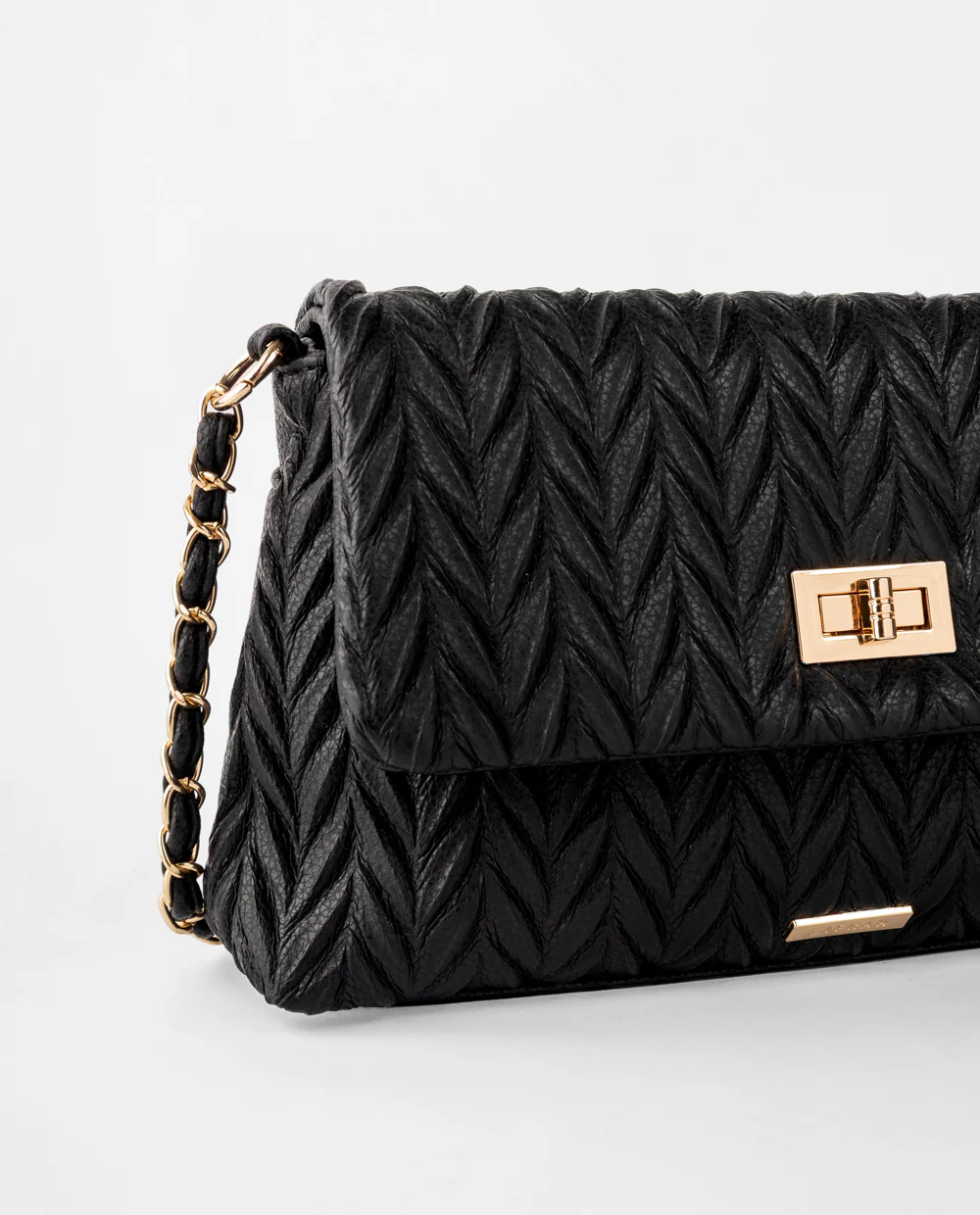 Cartera negra en material PU con diseño en patrón de espiga y tapa frontal con broche giratorio metálico. Incluye asa con cadena entrelazada que aporta un acabado elegante y resistente.