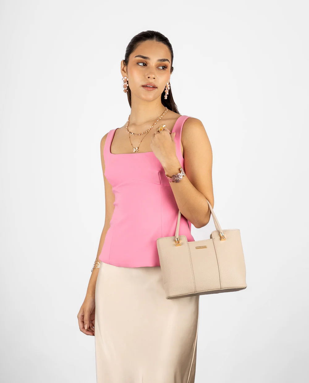Cartera tote beige de diseño estructurado con asas rígidas y herrajes dorados. Incluye correa ajustable y desmontable, para llevarla cruzada.