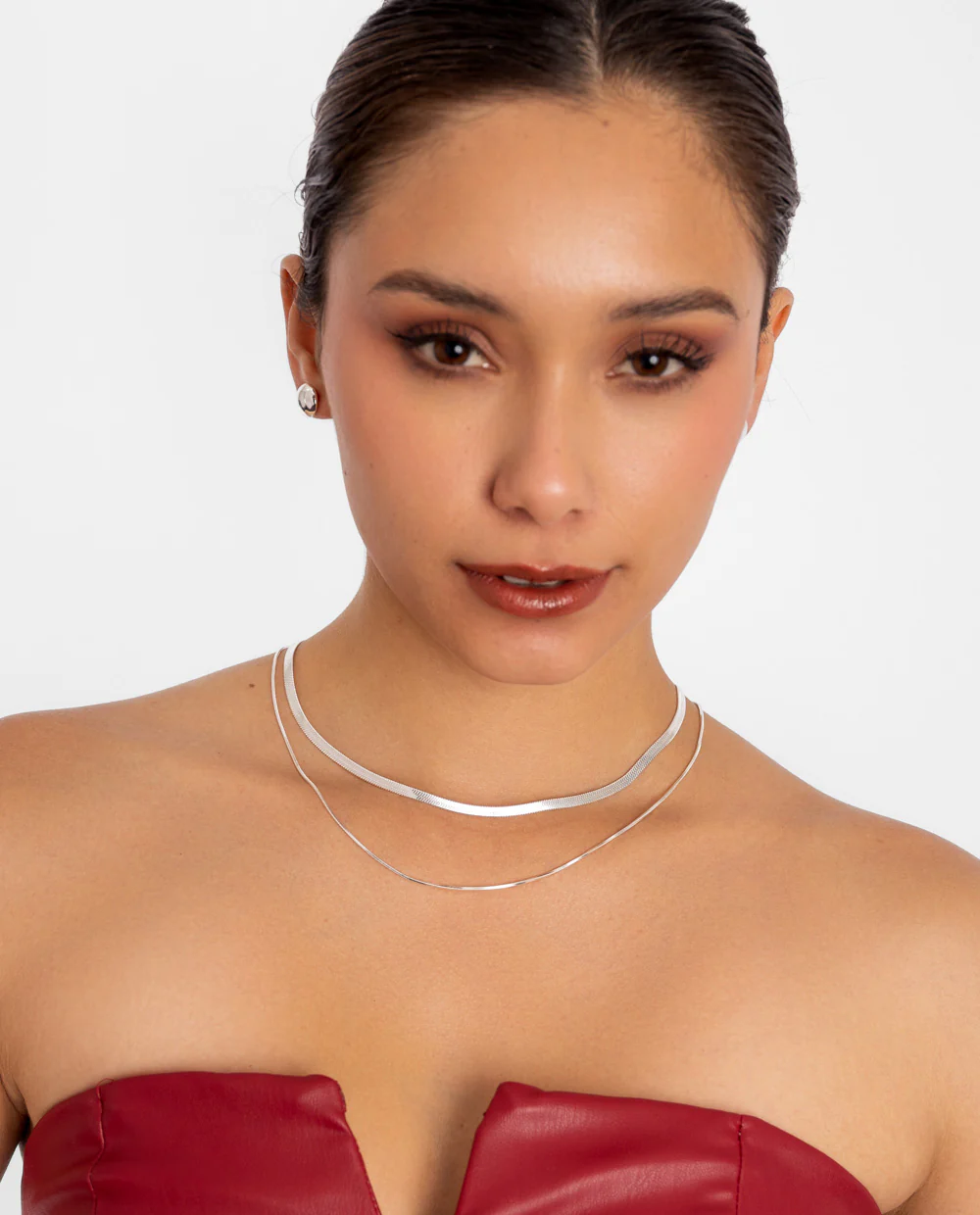 Set de collar doble en acabado plateado con cadenas planas y lisas, acompañado de aretes tipo esfera brillante. Su diseño minimalista y moderno aporta un toque elegante y versátil. Ideal para combinar con looks neutros o dar un aire sofisticado a un outfit de noche.