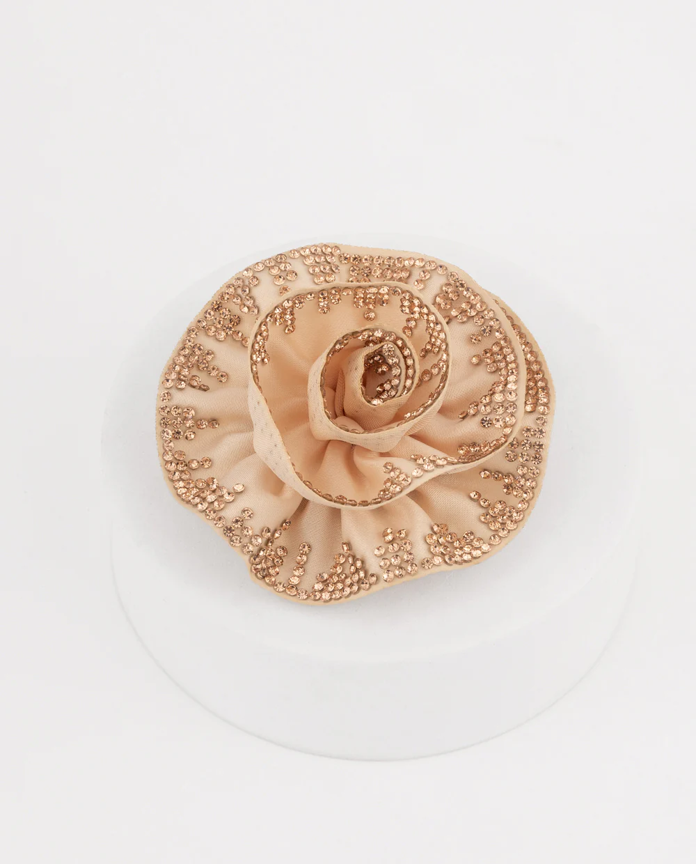 Sofisticado y elegante. El Gancho Flor Beige con Brillos Dorados tiene un diseño texturizado con un sutil efecto brillante, ideal para complementar cualquier look con un toque de glamour.