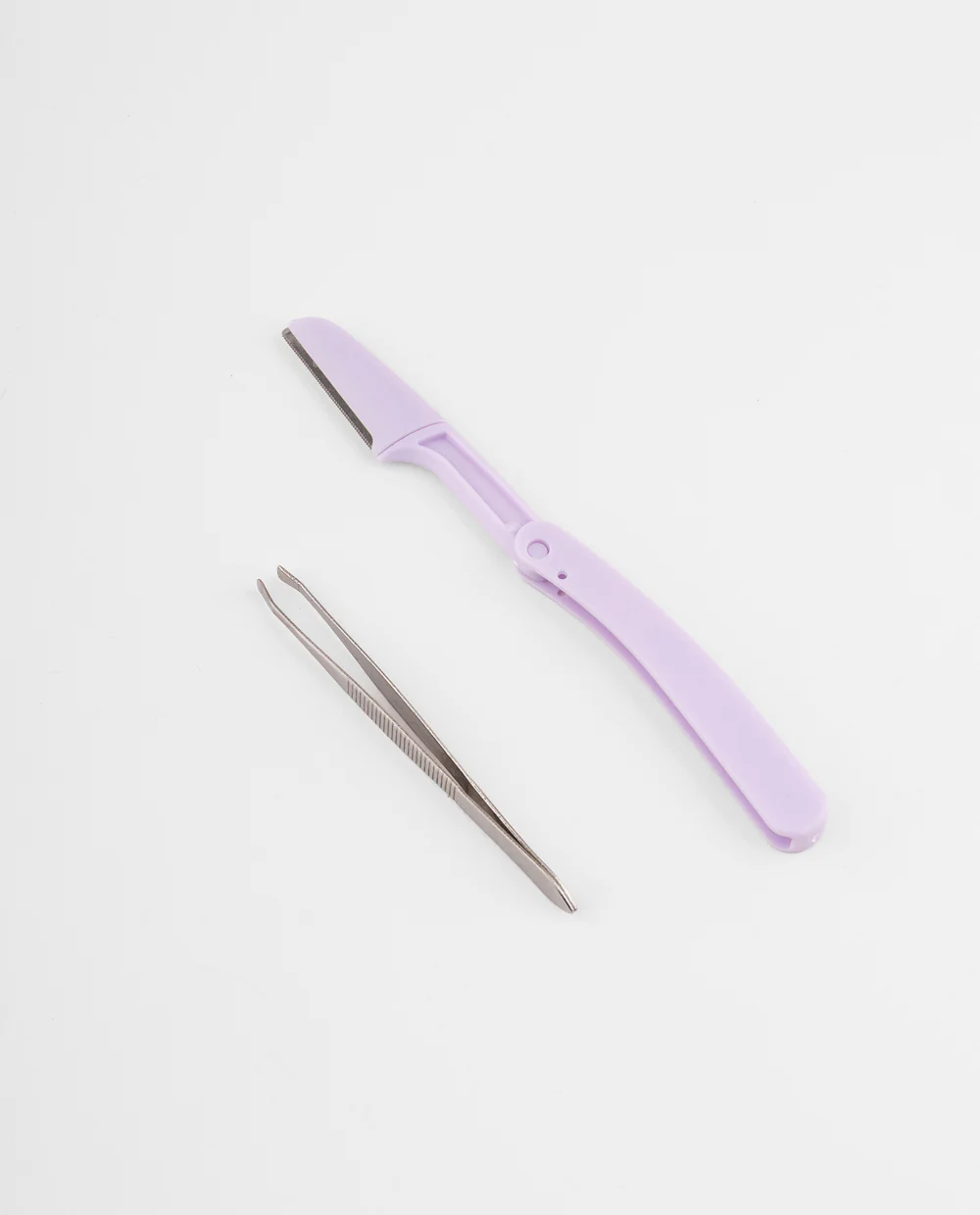 Set compuesto por una pinza metálica de precisión y un perfilador plegable con tapa protectora para definir y dar forma a las cejas con control y seguridad.