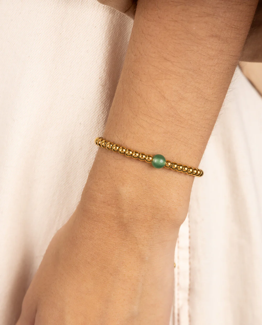 Pulsera elaborada en acero inoxidable bañado en oro, con delicadas cuentas doradas y piedra natural de cuarzo amazonita como protagonista. Su diseño ajustable la hace práctica y cómoda, ideal para usar todos los días. Un accesorio que combina elegancia y energía, perfecto para llevar sola o en layering con otras pulseras de la colección.