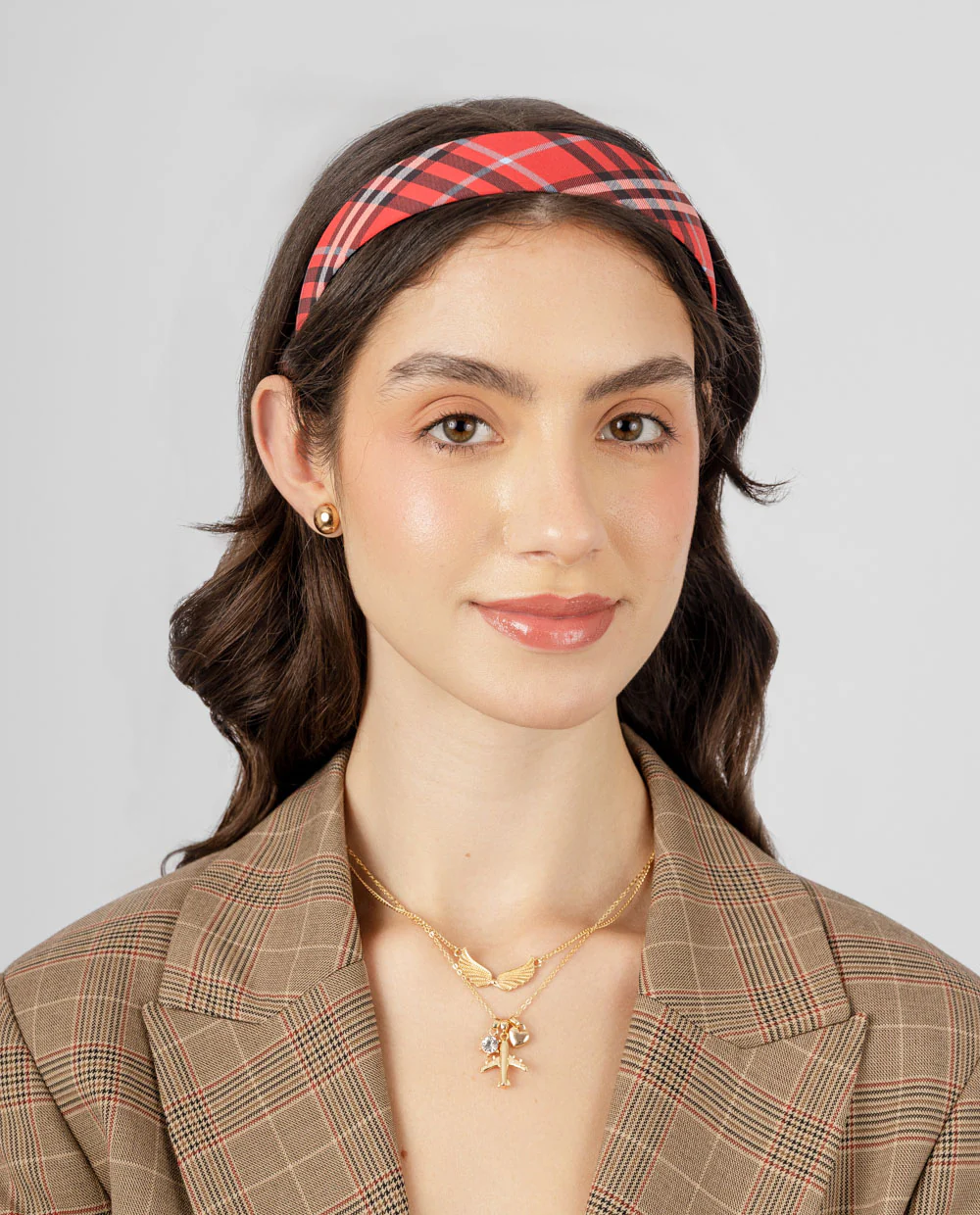 Vincha ancha con diseño cuadros rojo—